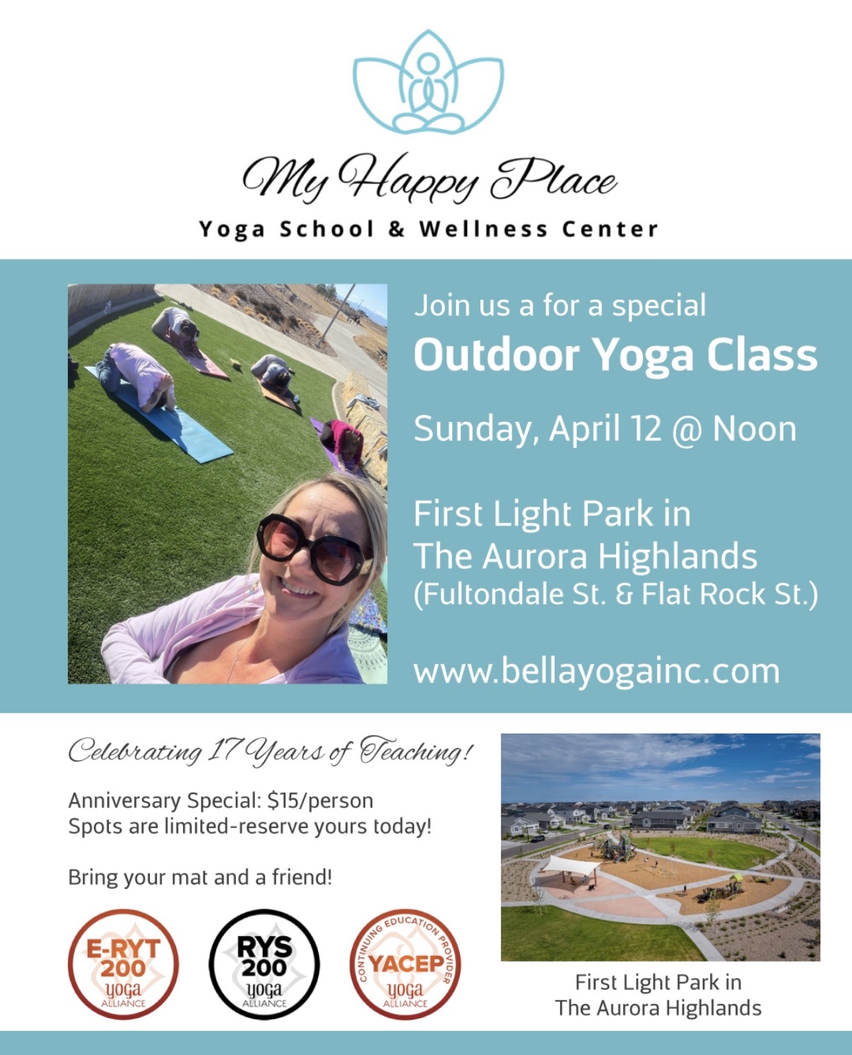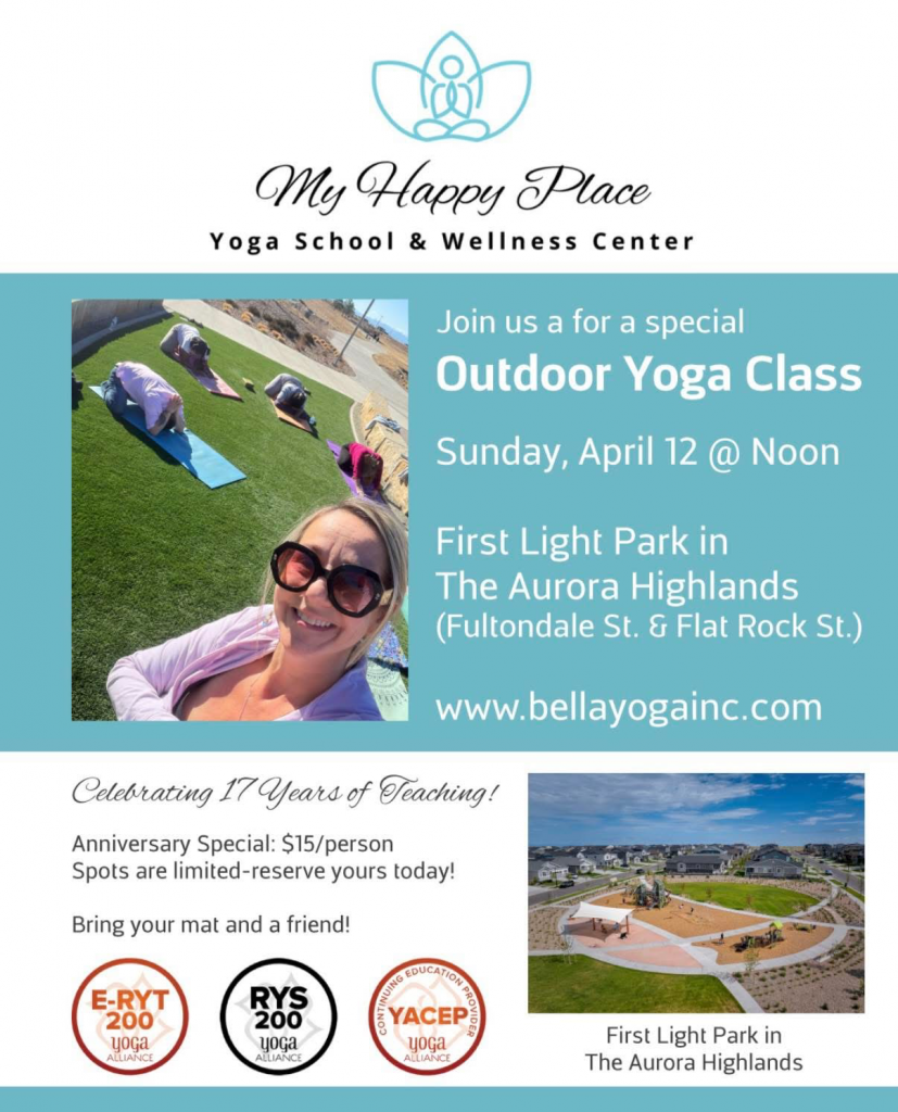 Check out our brand new yoga studio located in the Aurora Highlands! Classes offered daily at 12:30 PM and 6:30 PM.Â